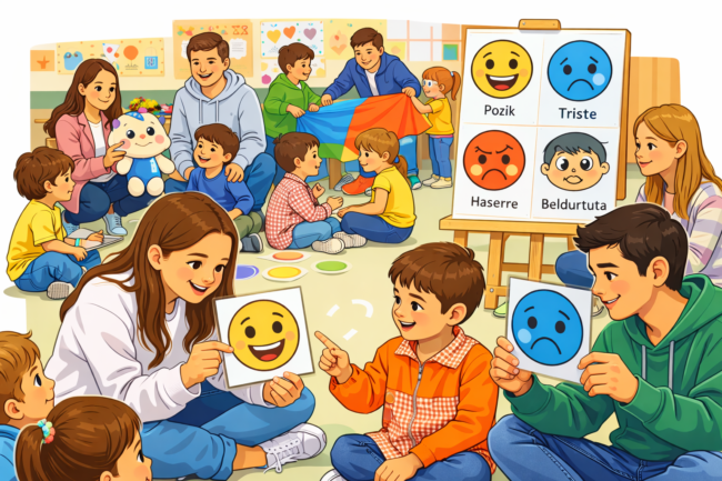 Aste honetan, Batxilergoko Psikologiako ikasleek jarduera aberasgarri bat egin dute Haur Hezkuntzako eta Lehen Hezkuntzako ikasleekin, emozioen lanketan oinarrituta. Jolasen, dinamika parte-hartzaileen eta adin bakoitzera egokitutako ekintzen bidez, ikasleek ikaskuntza-gune bat sortu dute, non enpatia, entzutea eta emozioen adierazpena izan diren protagonista nagusiak. Saioetan zehar, txikienek aukera izan dute egoera desberdinetan nola sentitzen diren identifikatzeko…