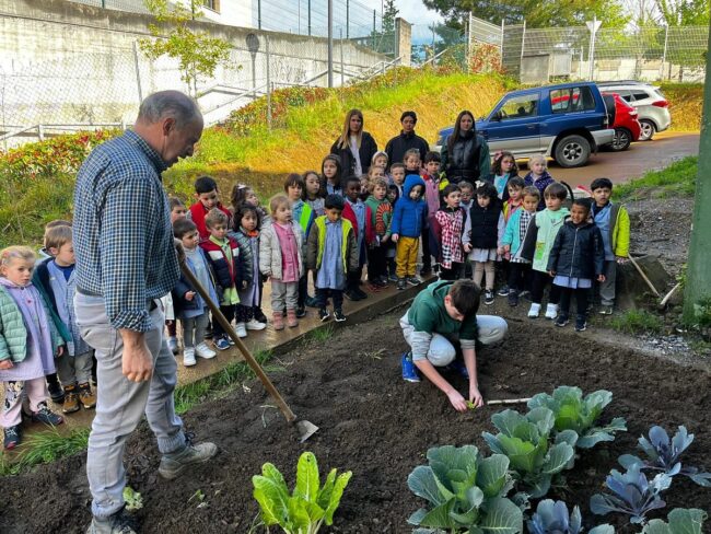 Haur hezkuntzako ikasleak ikastetxeko baratzera hurbildu dira, proiektuaren arduradun diren bigarren hezkuntzako ikasleek lagunduta.