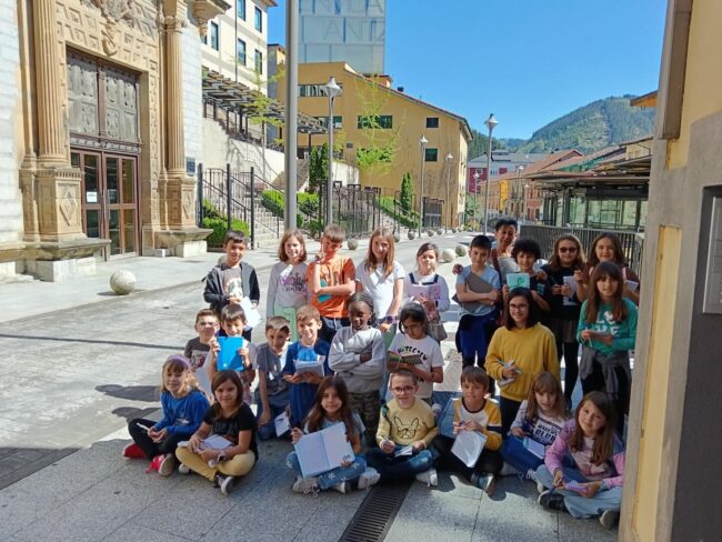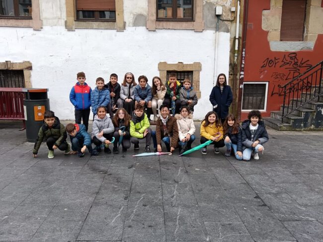 Lehen hezkuntzako hirugarren mailako ikasleak Ermuko kaleetan dabiltza mapa eta planoa erabiltzen ikasteko.