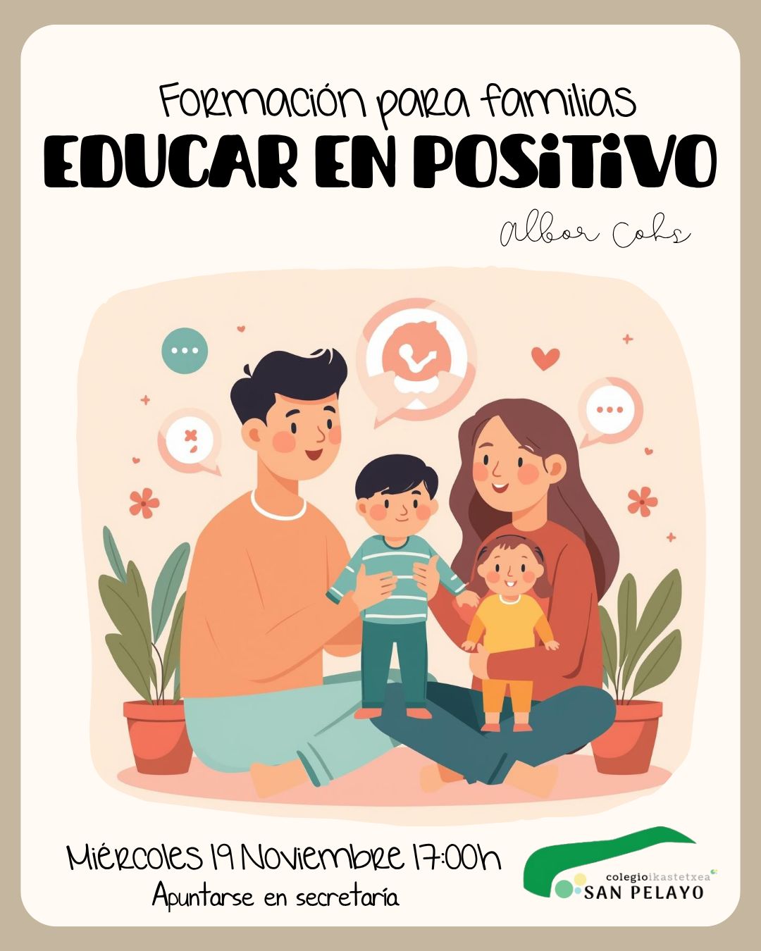 Datorren azaroaren 19an, asteazkenean, 17:00etan, egingo da ikastetxean familientzako lehen prestakuntza saioa, “Hezi modu positiboan” izenburupean.